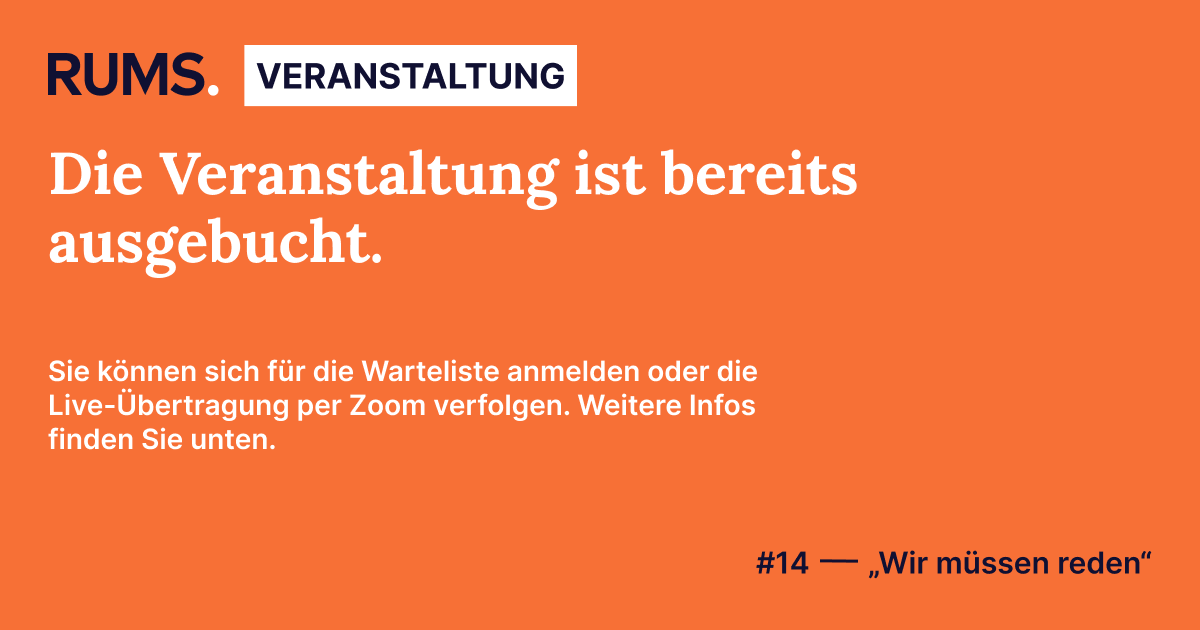 Der Eintritt ist frei und nur mit Anmeldung möglich. Die Veranstaltung ist bereits ausgebucht. Sie können sich hier per E-Mail auf die Warteliste (Stehplatz) setzen lassen.